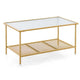 A stylish and functional coffee table featuring a marble print MDF top and a gold print metal frame for an elegant touch. The two-tier design offers extra storage and display space.