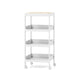 This ultra-slim storage cart offers maximum organization with 4 open shelf tiers and a convenient slide-out feature, perfect for tight spaces in kitchens, bathrooms, or offices.